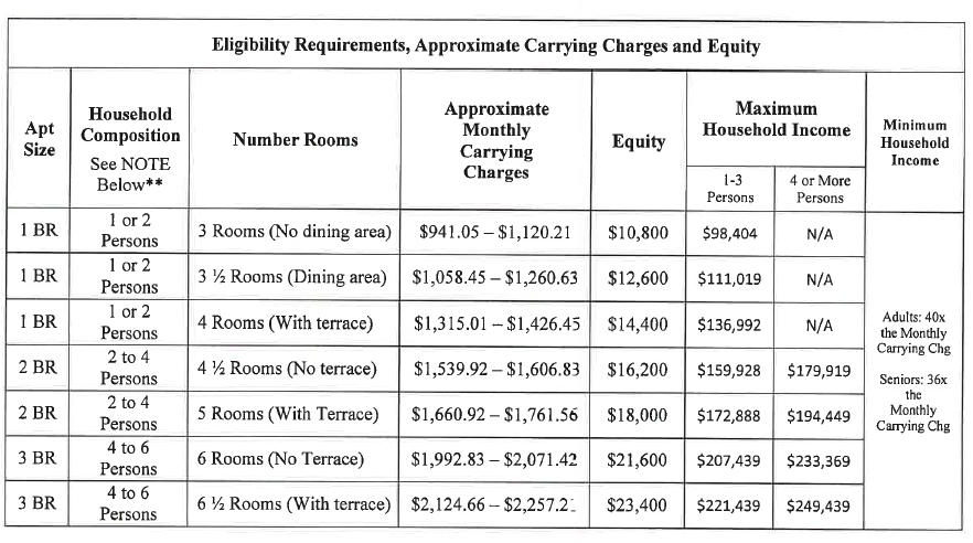 *** Based on the total household income for the prior calendar year, less $1,000 for each personal and dependent exemption, and less $20,000 (or actual earnings if less) for each secondary wage earner. Households of three persons or more whose income does not exceed 125% of the maximum income listed shall also be eligible for admission and shall pay a carrying charge surcharge. Household income must be within the allowable income limit at time of application and at time of apartment availability.